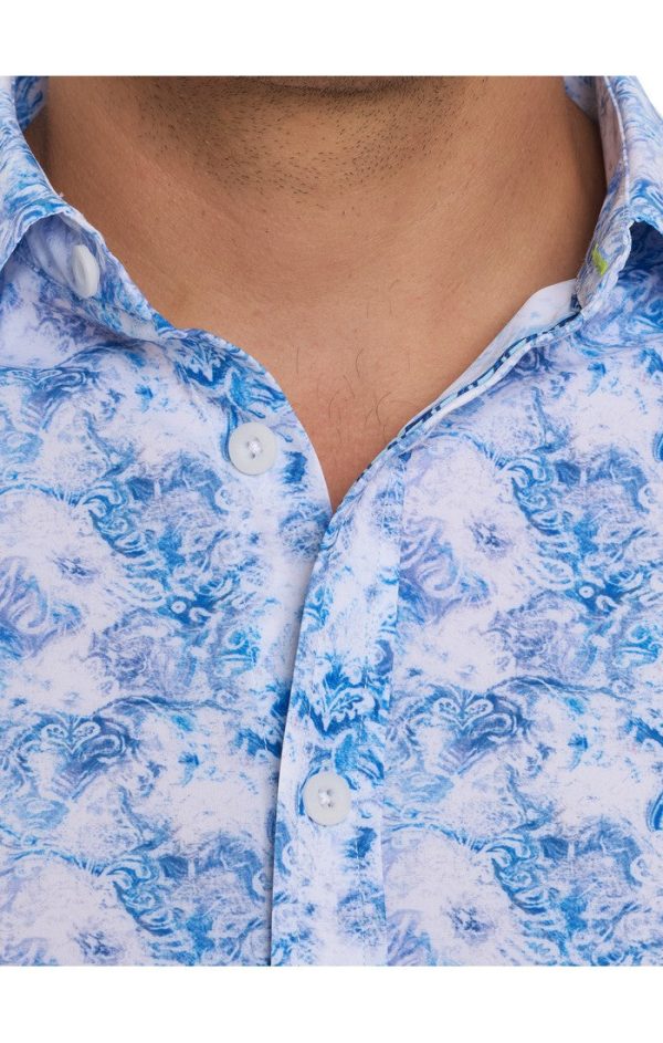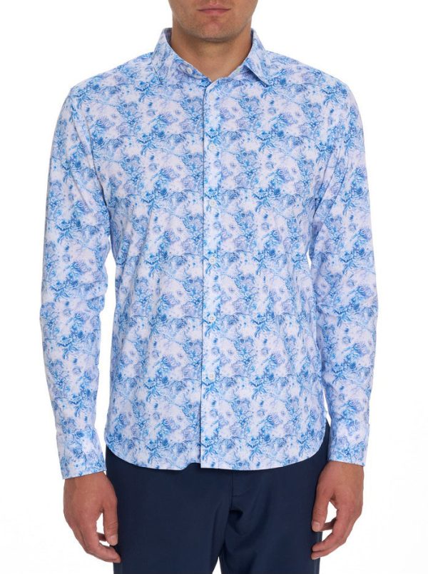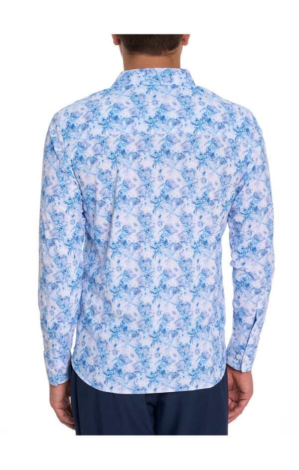 Soft floral and paisley burnout pattern forms a lattice print up and down this long sleeve Performance Stretch knit shirt with point collar from Robert Graham.