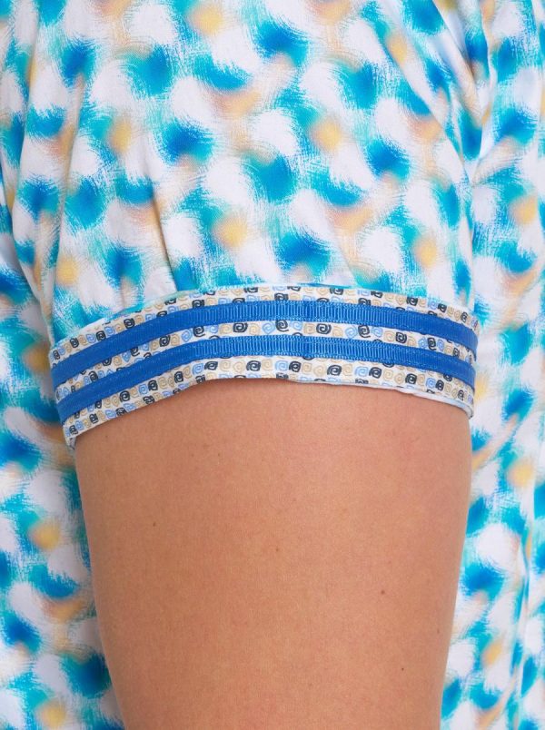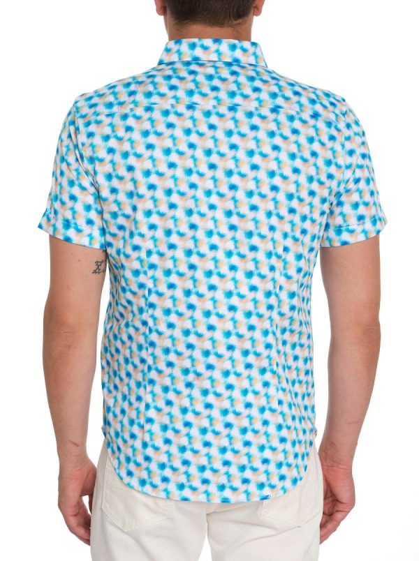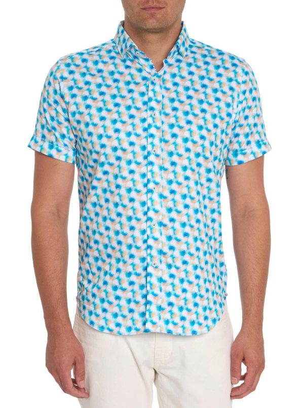 It’s all a blur with this abstract repeat geometric satin print button down shirt in all cotton and colored in the pastel shades of summer.