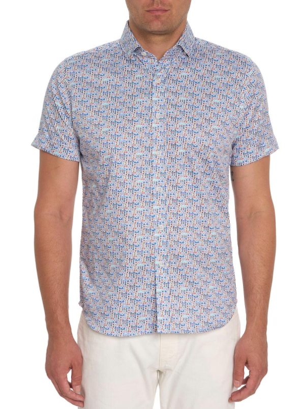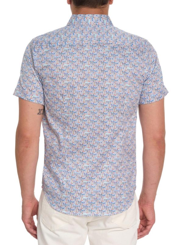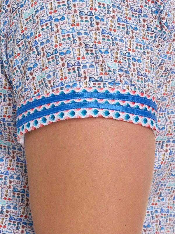 An abstract geometric of miniature sunglasses are printed all over this cotton satin button down short sleeve shirt. Shades of Robert Graham to be sure.