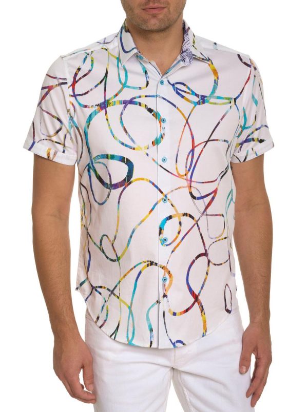 We don’t recommend you spend time tracing it, but this multicolor swirl pattern is amazingly in one continuous line that circles throughout this short sleeve shirt on a white ground.