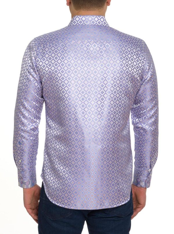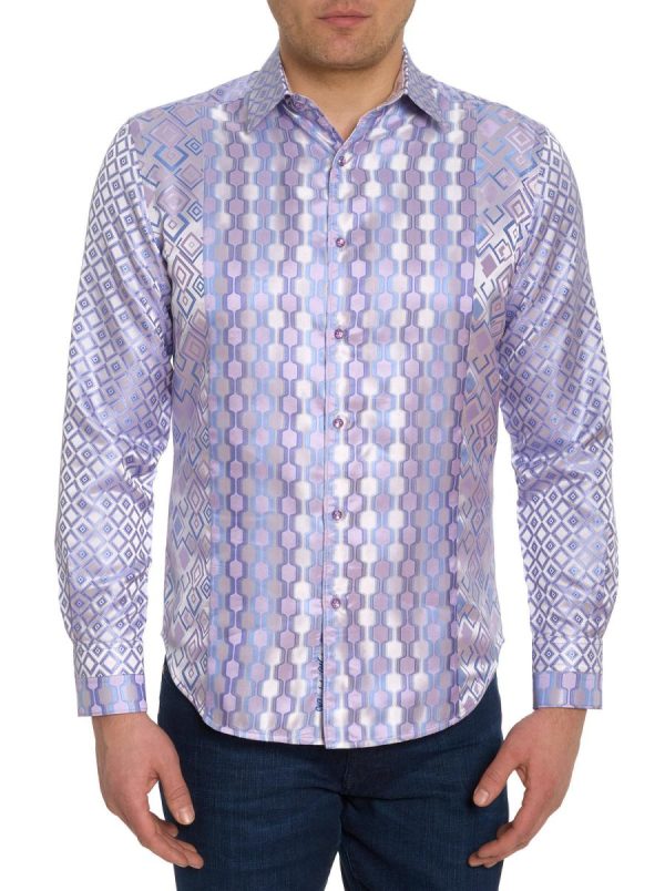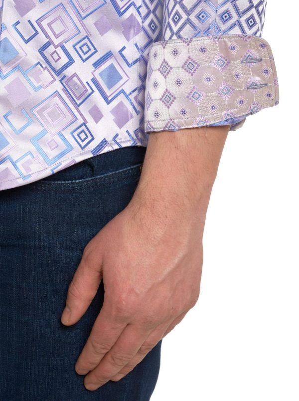 Robert Graham works in a series of vertical geo motifs with this 100% silk jacquard #WearableArt monochromatic tone long sleeve shirt with a subtle sheen throughout. Flip the cuffs for a contrast pattern that adds yet another dimension of style.