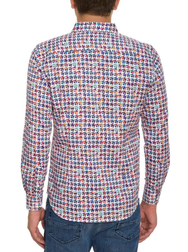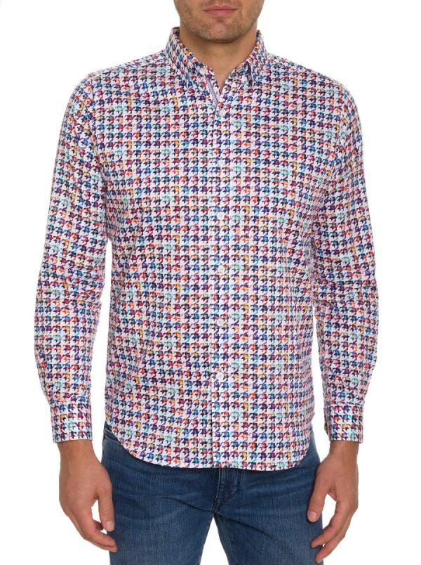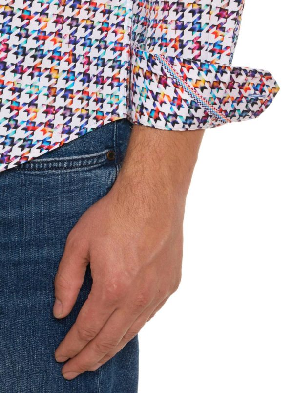A multi-hued giant houndstooth check adds bold style to this 100% cotton long sleeve shirt with point collar. Contrast scallop trim inside the placket. Flip the cuff for diagonal ribbon detailing.