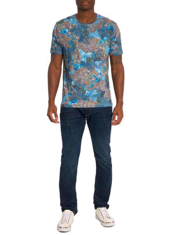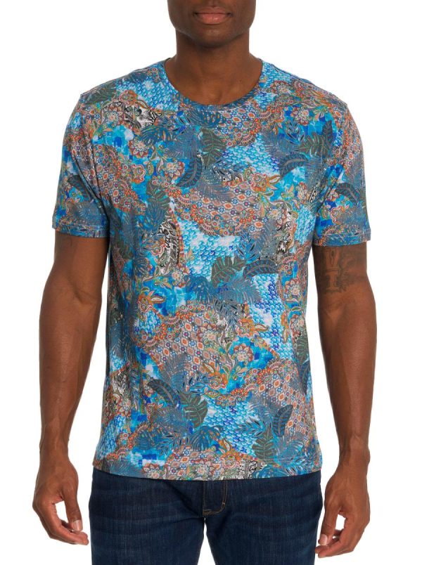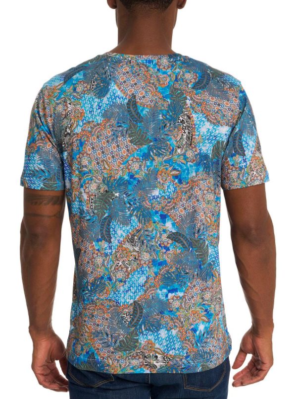 All allover camo pattern with an artful collage of tropical florals, geometrics and foulard patterns flashes across this 100% cotton graphic T-shirt from Robert Graham. Pair with RG’s beach-to-bar shorts.