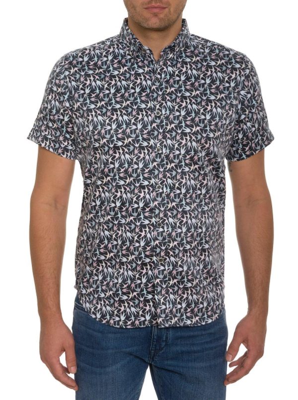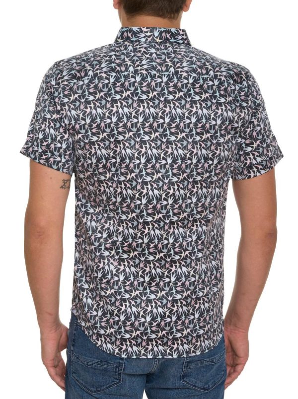 A multicolor print of flying doves renders this short sleeve, linen and cotton blend button-down shirt a summer must-have. Flip the cuffs for a double ribbon band.