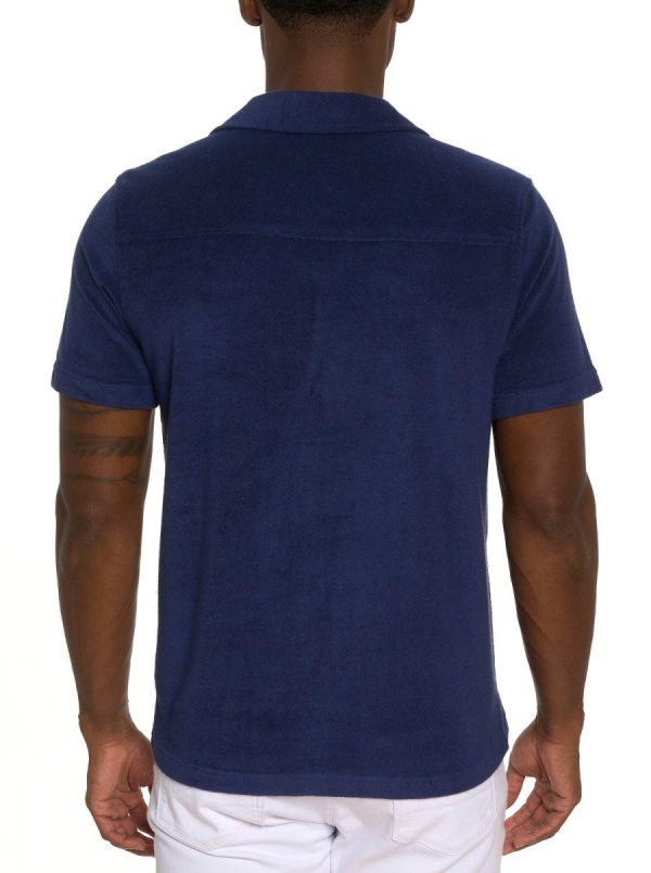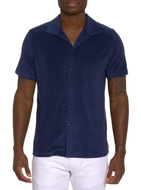 Timelessly stylish and always comfortable, Robert Graham’s short sleeve button front solid knit shirt in fine terry cloth in mostly cotton. Wear it to the beach or the bar.