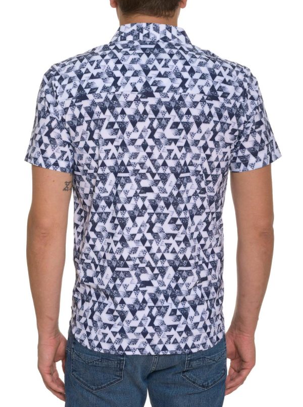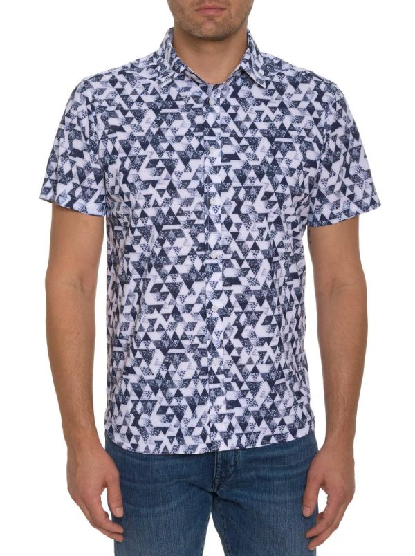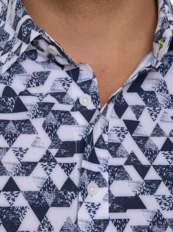 This handsome geometric print looks outstanding on this short sleeve, button front performance knit shirt in black and white. The one to wear with Robert Graham jeans.