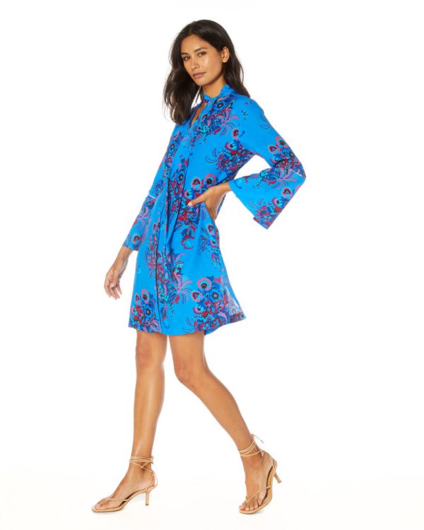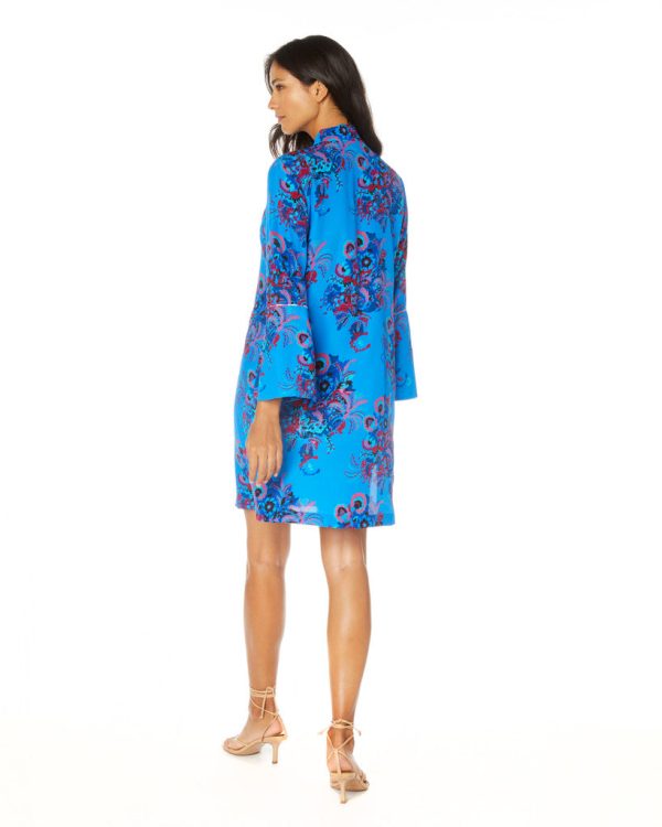 A hand painted floral paisley print frames this bouncy dress designed to hit just above the knee. We love the self- tie neck and flare of the bell-shaped sleeve cuffs. Side slit seams make this an easy to wear for lunch, brunch, or dinner. Finished with contrast piping details.