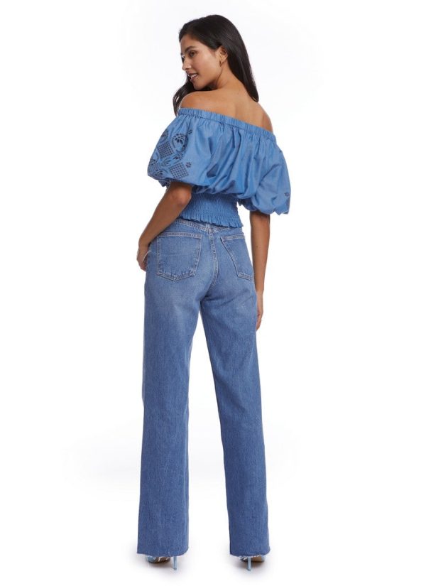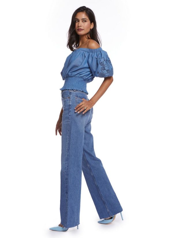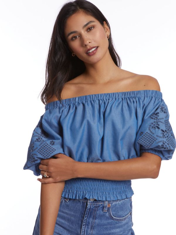 Our new romantic blouse silhouette for the season in a cotton blend chambray is this smocked waist top with adjustable embroidered eyelet balloon sleeves Wear it off the shoulder with your favorite RG jeans.