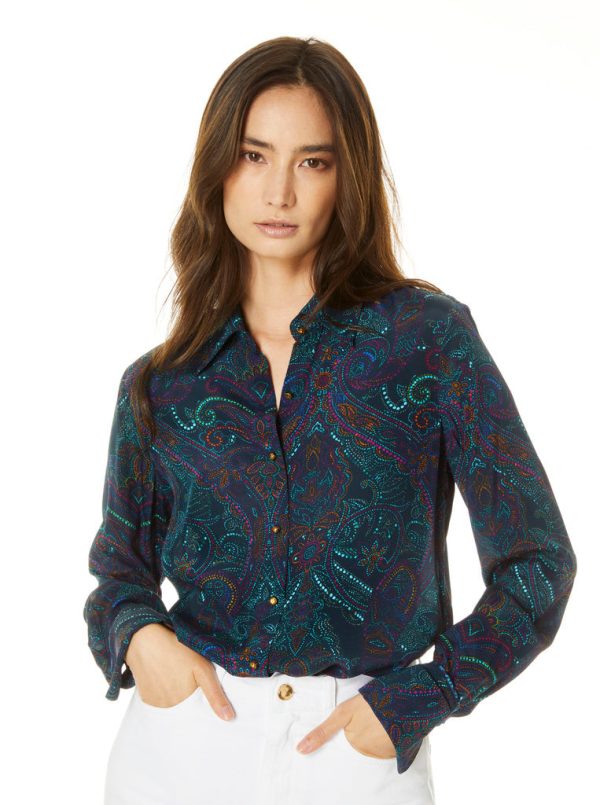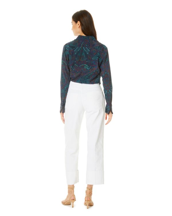 Every well dressed woman needs that look at me head turning piece. This pop art paisley silk blend blouse is yours. Luxuriate in this modern relaxed fit with a gently tapered waist, a hidden button to prevent gaping and pulling at the bust and long sleeves with a luxe French cuff.