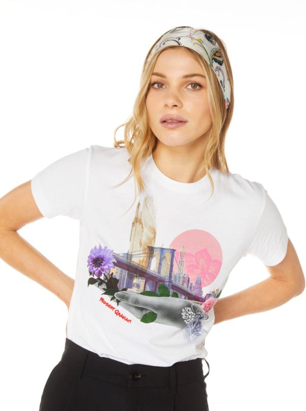 Even if you don’t live in New York City you can still take Manhattan. Our citified designers have billboarded a graphic print of the Big Apple skyline across the front of this fun 100% cotton short sleeve T-shirt. An embroidered “I heart RG” at the lower left hem is a reminder of where it came and who designed it. Fitting, we think.